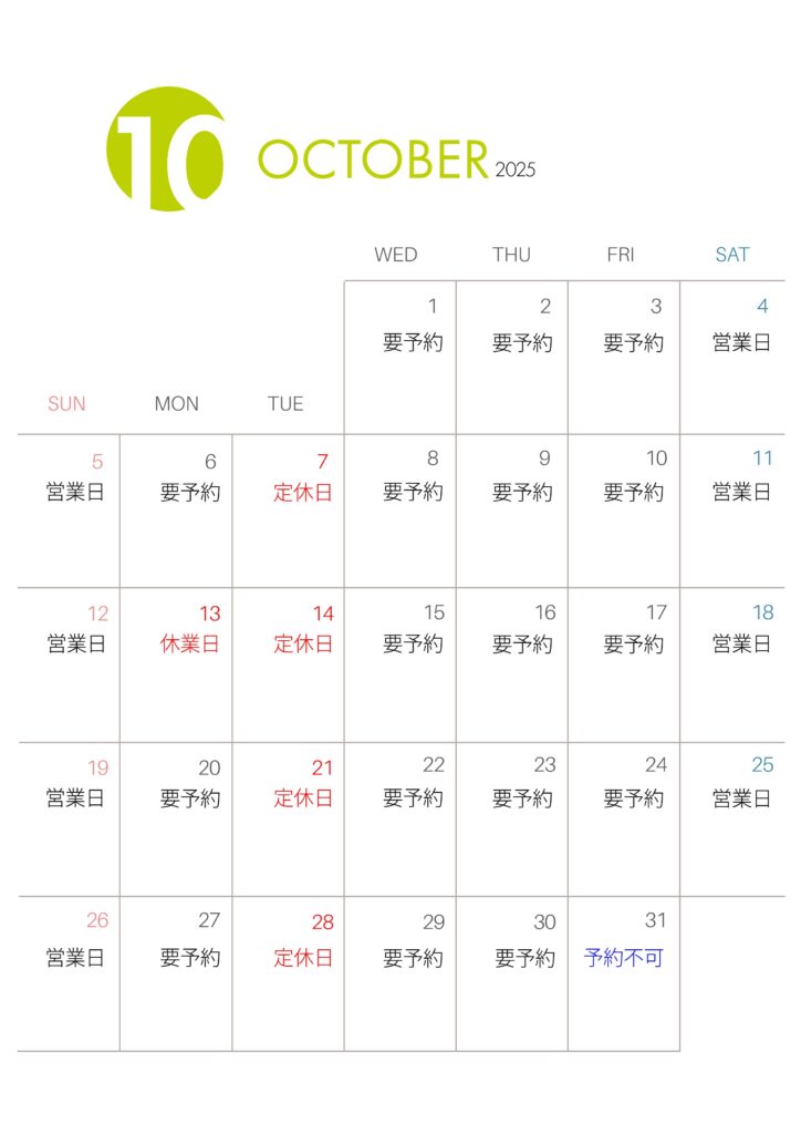 ※「要予約」日でも、先約等でご希望の日時にお応えできない場合があります ※ 直前のご予約は、ご希望の日時に対応できない場合があります