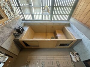 実際の施工事例では、海外製シャワーと石浴槽を組み合わせたオーダーユニットバスを実現しました
